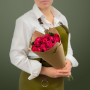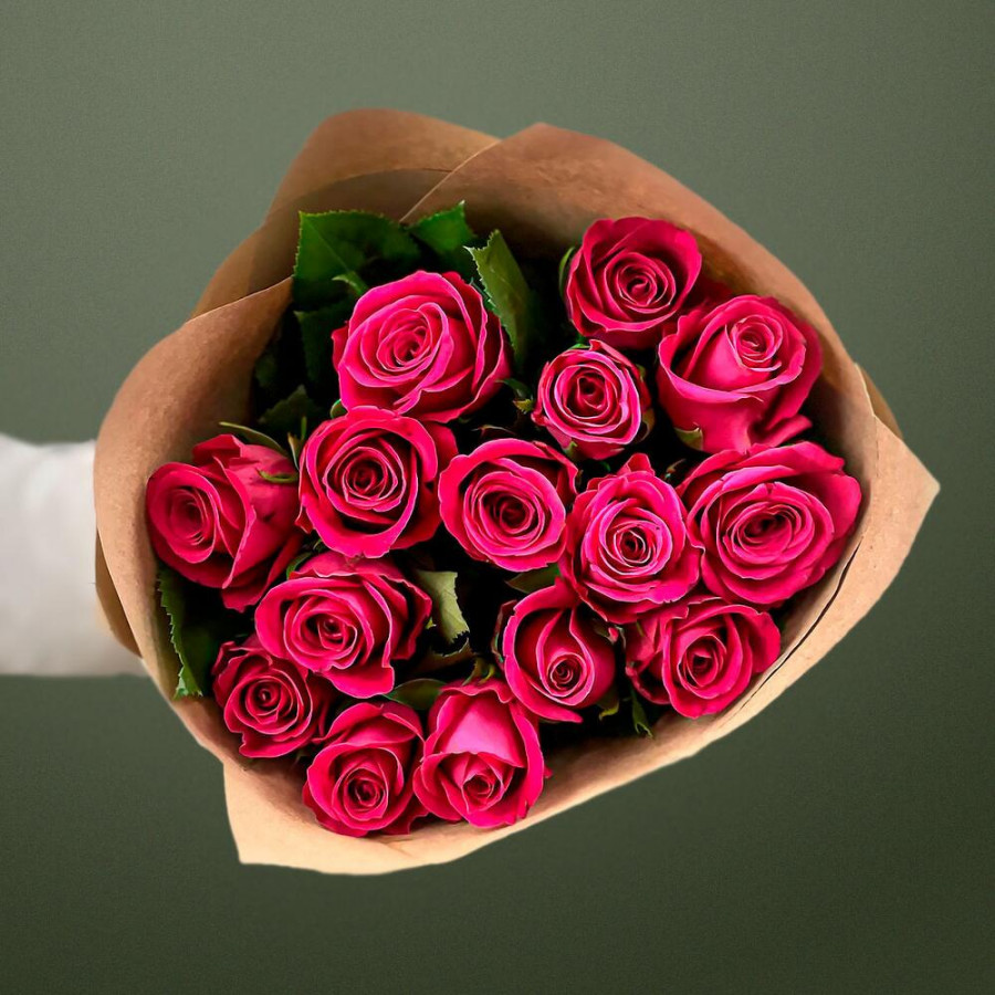 На фото букет из 11 малиновых роз. В составе: роза 11 шт, крафт-бумага 1 шт, атласная лента 1 шт, . Все цветы свежие и ароматные, букет красиво оформлен и отлично подходит для подарка. Доступна доставка цветов или самовывоз.