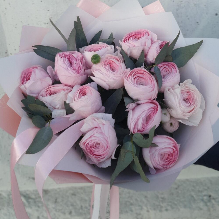 На фото букет из 15 розовых ранункулюсов. В составе: ранункулюс 15 шт, эвкалипт 2 шт, дизайнерская упаковка 1 шт, атласная лента 1 шт, . Все цветы свежие и ароматные, букет красиво оформлен и отлично подходит для подарка. Доступна доставка цветов или самовывоз.